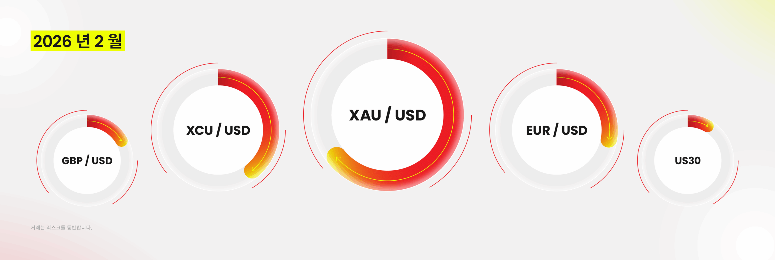 이러한 환경 속에서 현물 금(XAUUSD) 시장은 1월의 기록적인 급등락 이후 2월 들어 점차 횡보 조정 흐름으로 돌아섰습니다. 금 가격은 2월 초 1월 말 반등 흐름을 이어가며 한때 온스당 5,000달러를 다시 상회했지만 미 연준의 1월 회의록에서 매파적 신호가 확인되고 케빈 워시 지명 이후 정책 방향 전환에 대한 시장 기대가 높아지면서 점차 하방 압력을 받았습니다. 이에 따라 금 가격은 월중 최저 온스당 4,400달러 수준까지 하락했습니다. 변동성은 1월만큼 크지 않았지만 금은 여전히 대표적인 안전자산이자 투기적 거래 자산으로서의 특성 덕분에 해당 월 가장 활발하게 거래된 상품 중 하나로 거래량 상위권을 유지했습니다.