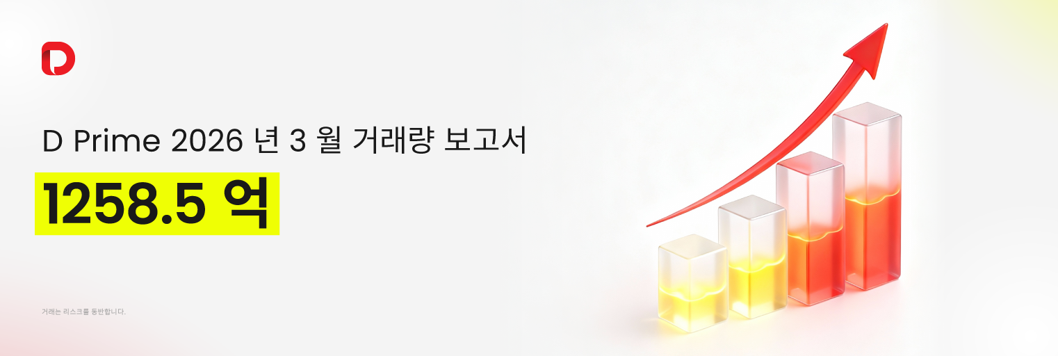 D Prime 등 거래 플랫폼에서 어떠한 거래를 진행하기 전에 고객은 각 금융상품의 거래 위험을 충분히 읽고 완전히 이해했는지 반드시 확인해야 합니다. 거래 및 투자와 관련된 위험에 대해 의문이 있을 경우, 고객은 반드시 독립적인 전문가의 조언을 구해야 합니다. 보다 자세한 내용은 D Prime 등의 고객 계약서 및 위험 공시문을 참조하시기 바랍니다.