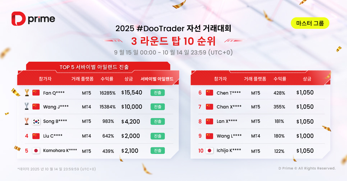 2025년 D Prime #DooTrader 자선 트레이딩 3라운드 월간 대회가 10월 14일23:59(UTC+0)에 성공적으로 마무리되었으며 최신 순위표가 공개되었습니다! 이어 4라운드 월간 대회가 2025년 10월 15일 00:00(UTC+0)에 개막했습니다. 전 세계의 트레이딩 고수 여러분, 지금 바로 참여하여 섬 결승전 진출의 주인공이 되어보세요!