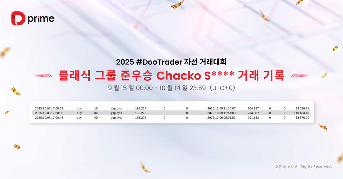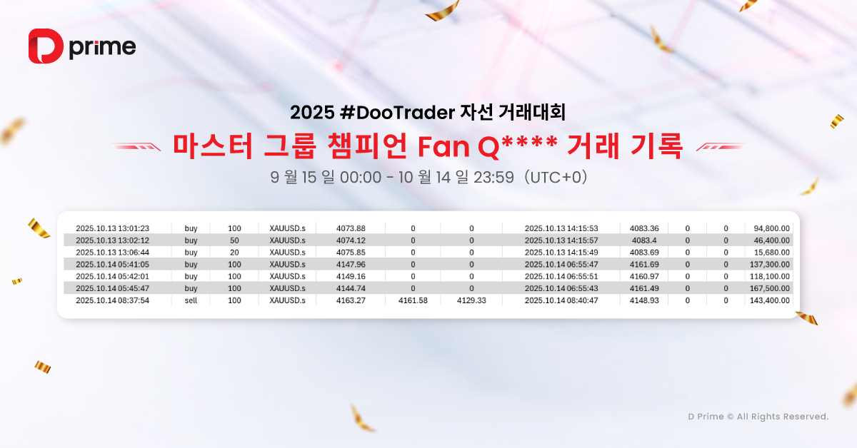 이번 대회에서도 D Prime의 주요 인기 종목인 XAU/USD, GBP/JPY, USD/JPY, EUR/USD, GBP/USD 등이 핵심 트레이딩 종목으로 주목받았습니다.