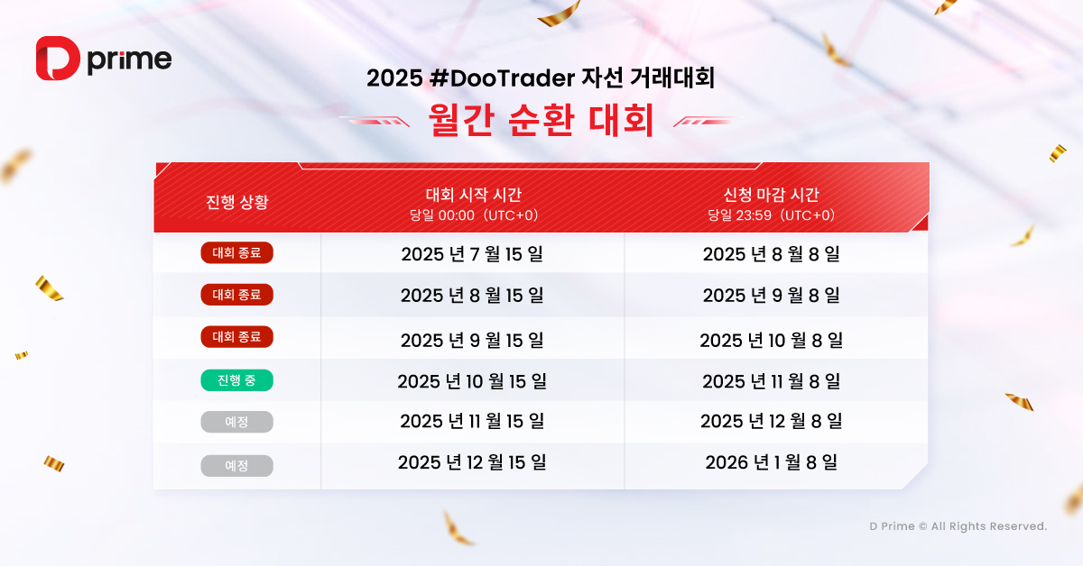 주목할 점은 2025 #DooTrader 자선 트레이딩 대회가 단순한 경쟁이 아니라는 것입니다. 참가자가 대회에서 1랏 거래를 완료할 때마다, D Prime은 참가자를 대신해 0.1달러를 기부하여 빈곤 아동들의 교육 환경 개선을 지원합니다. 즉, 여러분의 모든 거래가 더 많은 아이들의 미래를 밝히는 데 기여하게 됩니다.