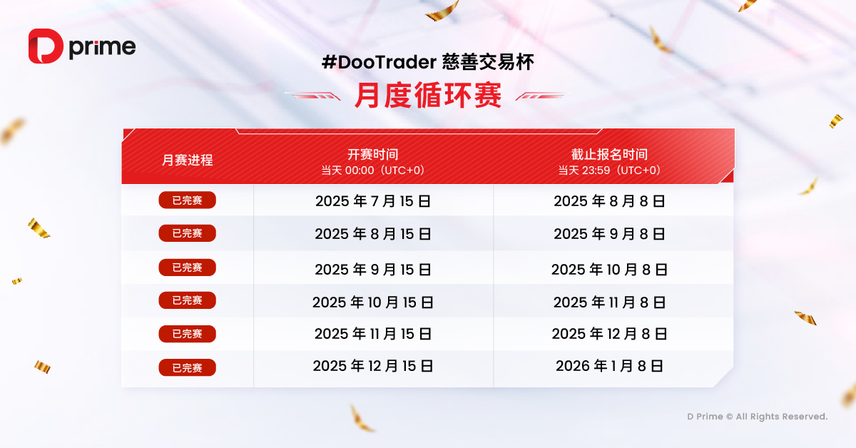 D Prime #DooTrader 자선 트레이딩 제6라운드 월간 대회가 1월 14일 23:59(UTC+0) 기준으로 성황리에 막을 내리며 치열했던 결과 랭킹이 공개되었습니다! 반년에 걸친 치열한 경쟁 끝에 6차례의 월간 대회가 모두 마무리되었으며 대회는 이제 서바이벌 아일랜드 최종 결전 단계로 공식 진입했습니다!