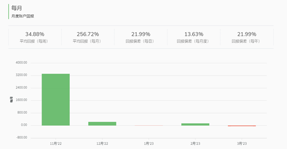 具体到每月的表现上,”小牛0001号”交易信号源大部分的收益均是在去年 11 月实现的,该月回报率为3,315.36%,随后的四月中,每月回报率基本维持在小亏或小赚的状态,较 11 月相比平稳许多。这背后的主要原因在于该交易信号源主要采用“波段策略”,该策略专注于在相对较短的时间范围内从价格行为的变化趋势中获利。这说明该信号源善于把握大行情走势,如果价格水平未出现大幅变化,该信号源的回报表现或许一般,可一旦出现符合自己的行情波段变化,便能把握行情,最大程度获利。
