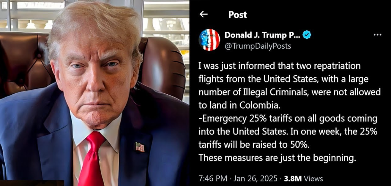 1 月 26 日,哥伦比亚总统佩特罗表示,哥伦比亚不会允许运载哥移民的美国航班入境。他在社交媒体平台 X 上发帖称,哥伦比亚将欢迎被遣返的移民乘坐民用飞机回国,“美国不能把哥伦比亚移民当作罪犯。”