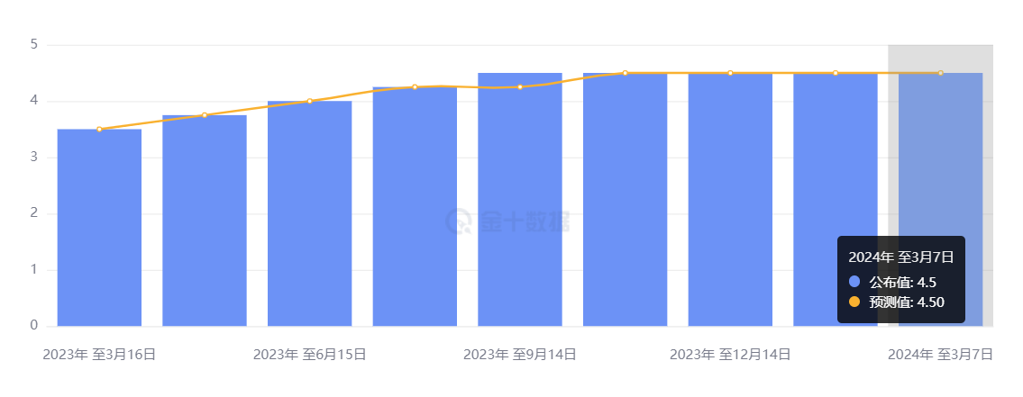 欧洲央行公布 3 月利率决议,如预期一致维持欧央行三大主要利率不变,将主要再融资利率、存款便利利率、边际贷款利率维持在 4.5%,4% 以及 4.75% 的历史高位。