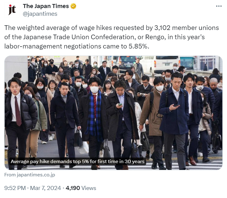 日本最大的工会联合会 Rengo 称,今年的涨薪要求为 5.85%,高于 2023 年的 4.49%,为 1994 年以来日本平均工资增长要求首次达到 5%。