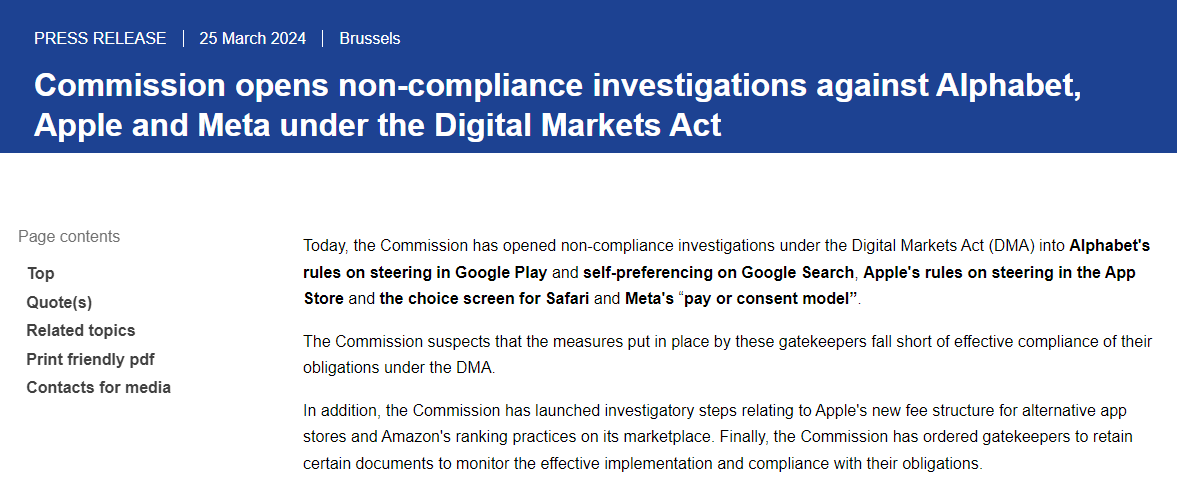 欧盟以《数字市场法》调查苹果、谷歌和 Meta