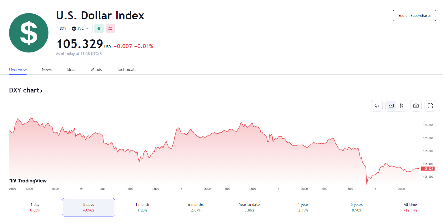 伴随着一系列最新出炉的美国经济指标不及预期,美元在美国独立日假期前夕出现了明显回落,衡量美元对六种主要货币的美元指数当天下跌 0.3%,报 105.404。