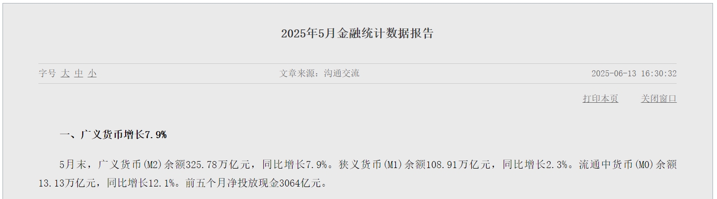 上周五(6 月 13 日),中国人民银行公布金融数据显示: