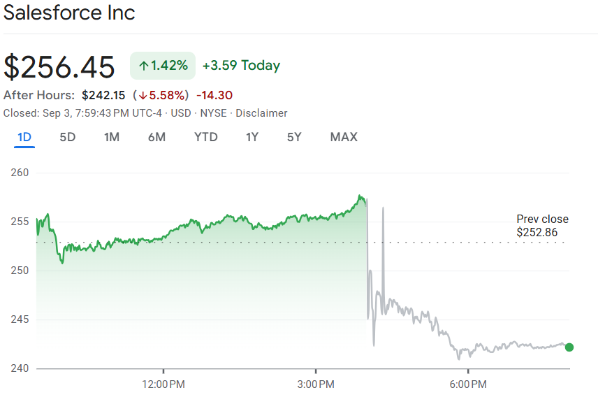尽管第二财季财报表现亮眼,公司在未来指引方面却未能给出惊喜。Salesforce 公布的 Q3 以及 2026 财年营收展望均低于市场预期。与此同时,公司宣布将启动 新一轮规模达 200 亿美元的股票回购计划。不过,指引不及预期削弱投资者信心,也使得 Salesforce 股价在盘后交易中一度下跌超过 5%。