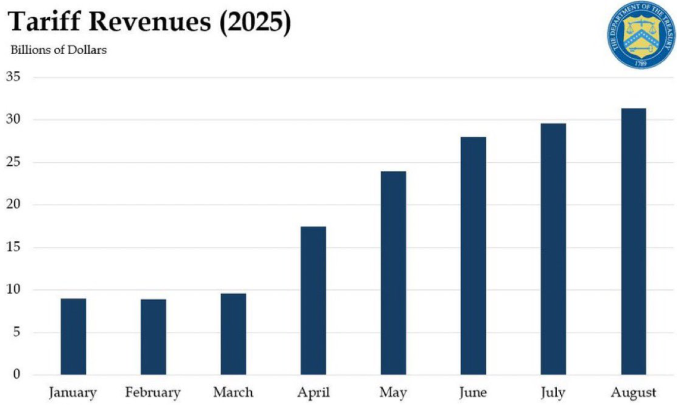 截至 8 月 29 日,美国关税收入在 8 月份达到 313.7 亿美元,创下单月历史新高。本财年累计关税收入已达 1835.6 亿美元。美国财政部长贝森特表示,随着关税收入持续增长,特朗普政府正在“努力收拾接手的财政困境”。