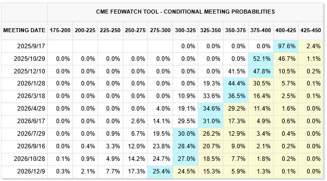 展望 10 月政策会议,工具显示,美联储维持利率不变的概率为 1.1%,累计降息 25 个基点的概率为 46.7%,而累计降息 50 个基点的概率略高,为 52.1%。