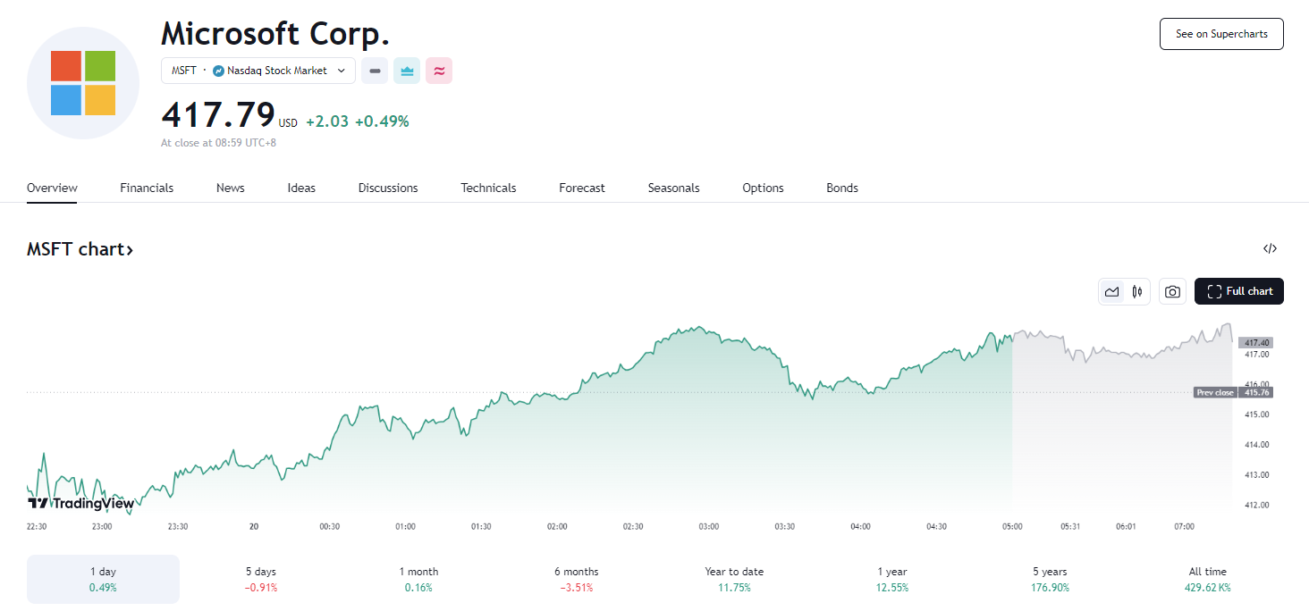 同日,微软(MSFT)股价涨 0.49%,报 417.79 美元。