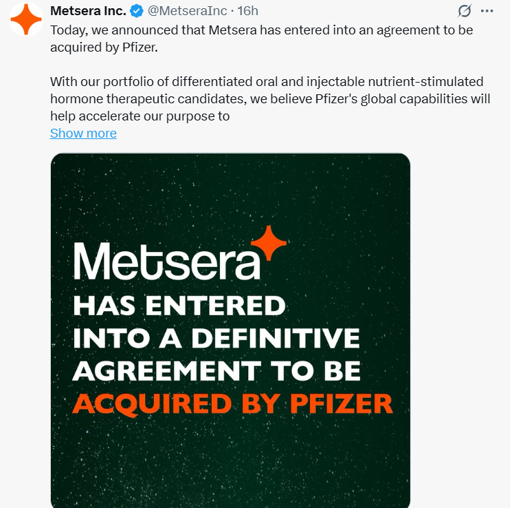 据《金融时报》报道,辉瑞(PFE) 已接近达成一项收购交易,拟以 73 亿美元 收购减肥药研发企业 Metsera(MTSR),最快或在本周一正式宣布。