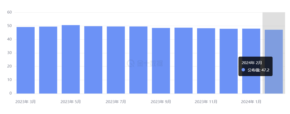 美国 2 月 ISM 制造业指数 47.8,不及预期的 49.5,1 月前值为 49.1,不仅在过去 16 个月里持续处于收缩态势,其中新订单、就业等分项指标均陷入萎缩。