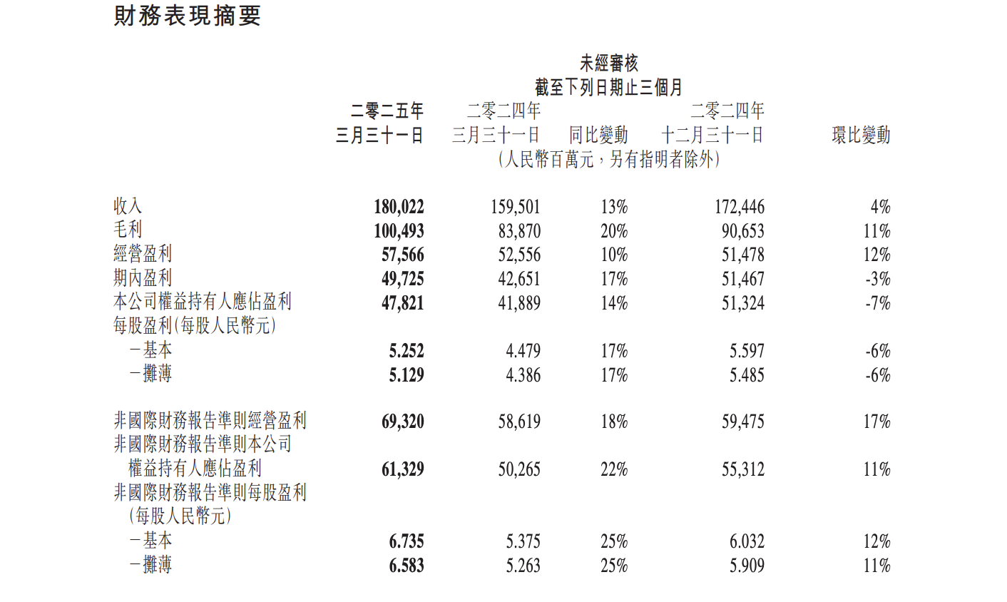 腾讯控股发布 2025 年第一季度财报显示,其实现营收 1800.2 亿元,同比增长 13%;非国际会计准则归母净利润为 613.29 亿元,同比增长 22%。营收和非标归母净利润均高于市场预期的同时,营收实现了双位数增长,且与非标归母净利润的增速差距有所收窄。