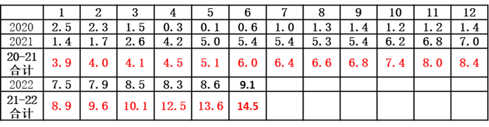 2020 年以来美国 CPI 各月同比增长(%):