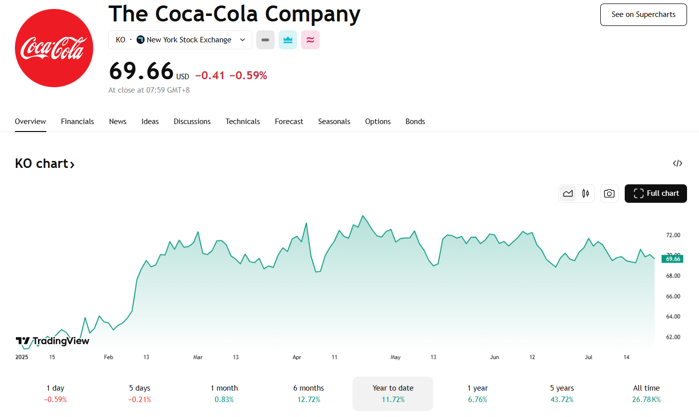 尽管财报表现良好,可口可乐股价周二美股盘前略有回落,今年迄今已累计上涨超过 13%。