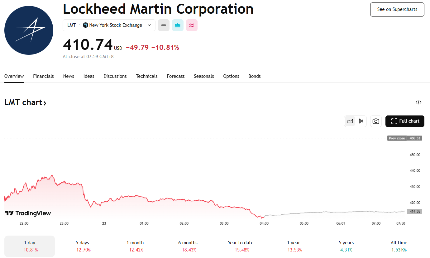 洛克希德马丁预期,2025 财年全年每股收益将在 21.70 美元至 22 美元区间,较之前最高 27.30 美元的预期有所下调。