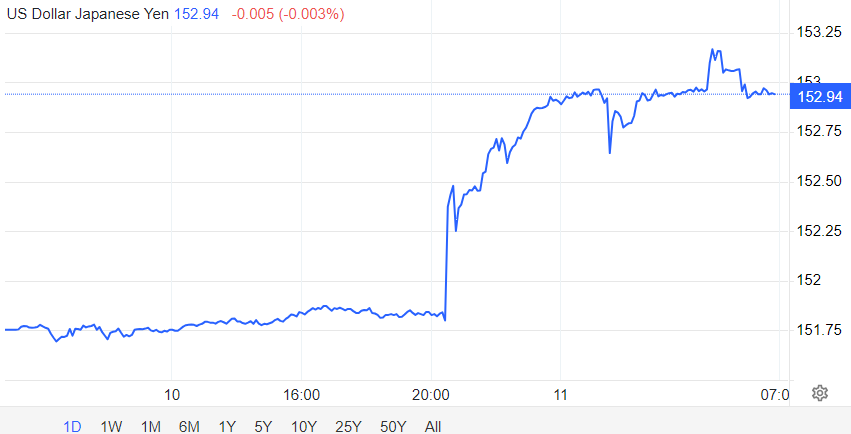 日元对美元失守 152 重要关口,这一数值点位被市场认为是日本当局外汇干预的警戒线。随后跌幅进一步扩大,创下自 1990 年 7 月以来的最低水平,美元兑日元现报 152.86。