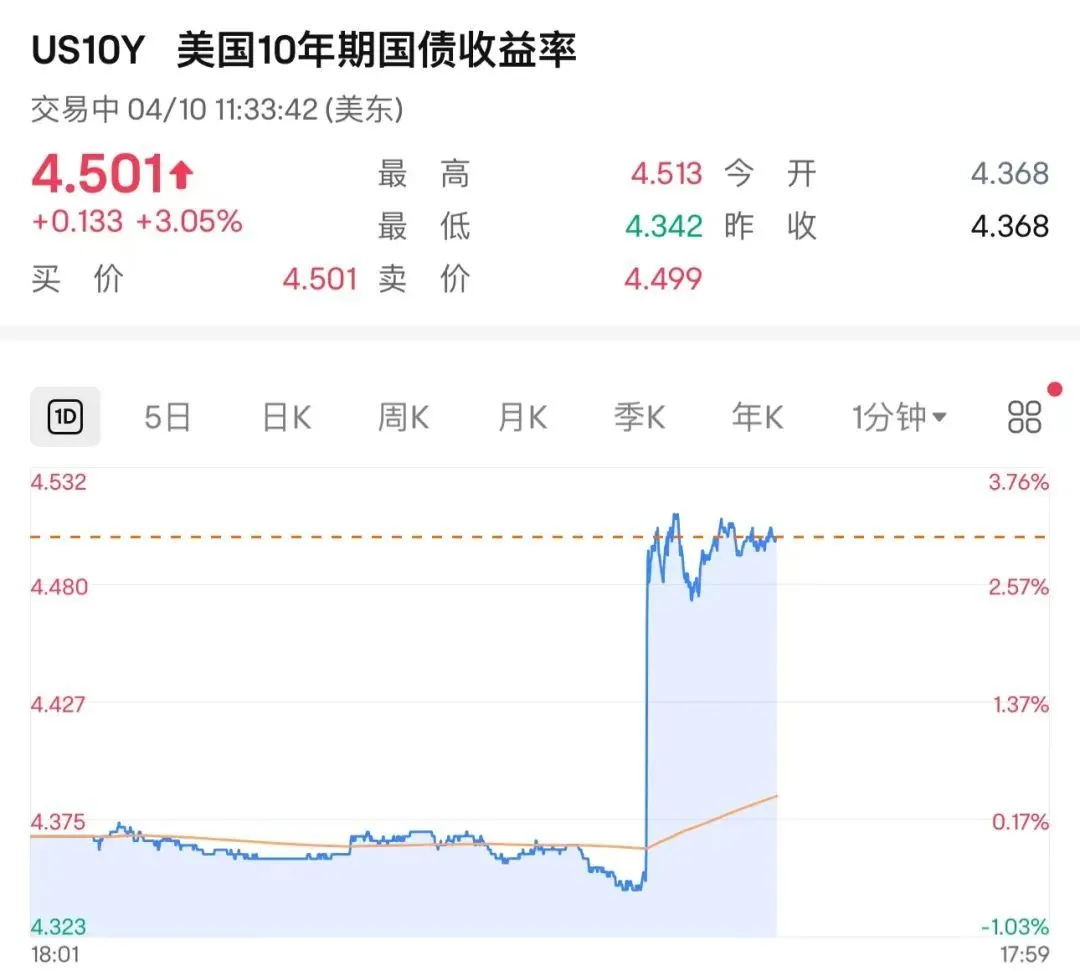 美国国债收益率飙升,十年期美债收益率一度破 4.5%。