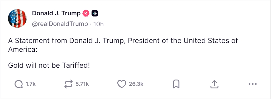 当地时间周一,美国总统特朗普在社交媒体上发文称:“黄金不会被征收关税!” 此前,一项联邦裁决曾在全球贵金属市场掀起剧烈震荡,此番表态为市场吃下 “定心丸”。