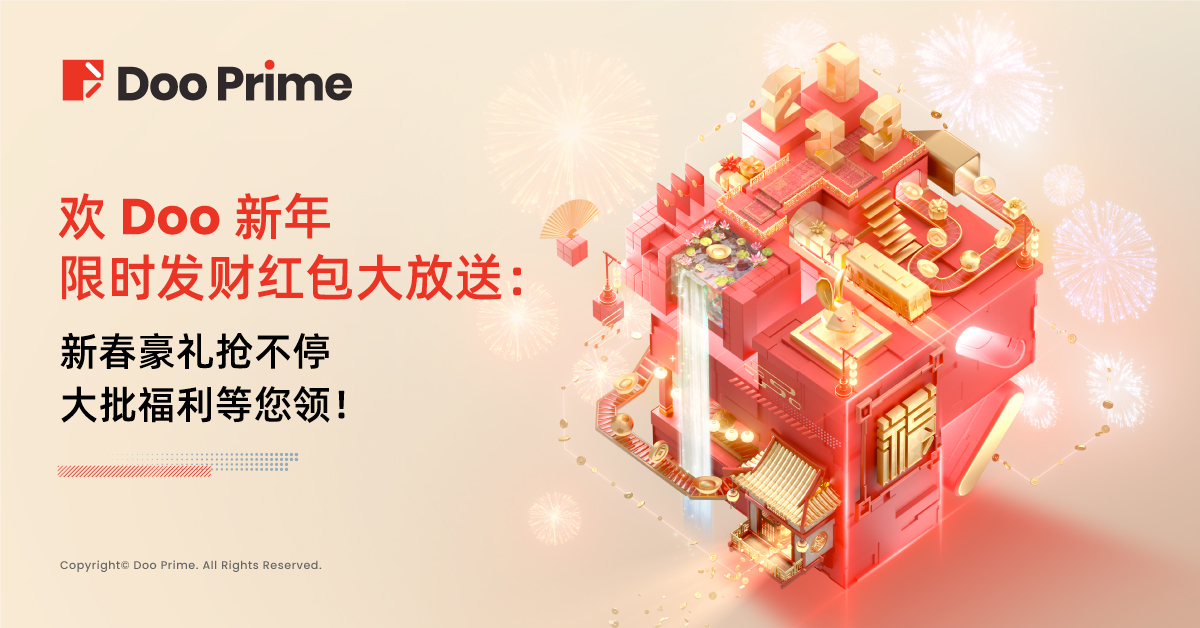 2022 年 Doo Group 精心筹备的海量回馈活动获得了全球客户的积极支持和热情参与。 2023 年我们将继续为大家送上多元化福利和活动,并以丰厚的奖励向全球客户表达真挚感谢。为此,在新春佳节来临之际,Doo Prime 开启 “欢 Doo 全球大抽奖” 和发财红包限时抢活动,把春节祝福和福利送给广大客户。
