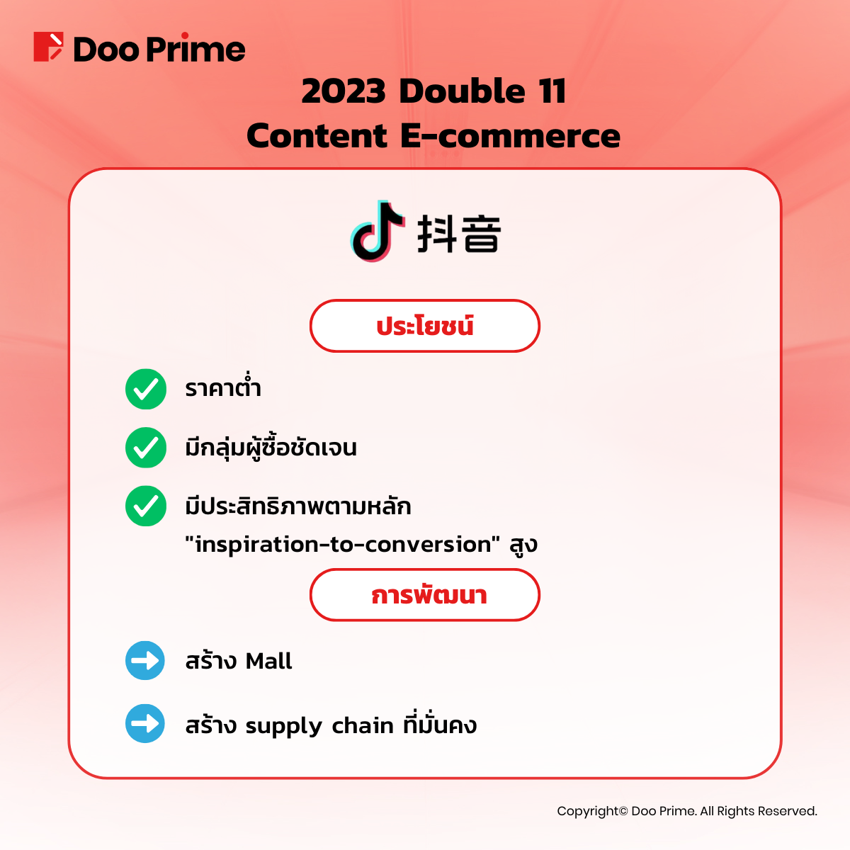 Douyin เสนอการรวมการเน้นContent พร้อม Shelf-based เพื่อเปลี่ยนแปลงแพลตฟอร์ม “สู่การเติบโตครั้งใหม่” และเป็นการพัฒนาในระยะยาว ชื่ออย่างเป็นทางการของ Douyin สำหรับงานในปีนี้คือ “Douyin Mall Double 11 Festival”