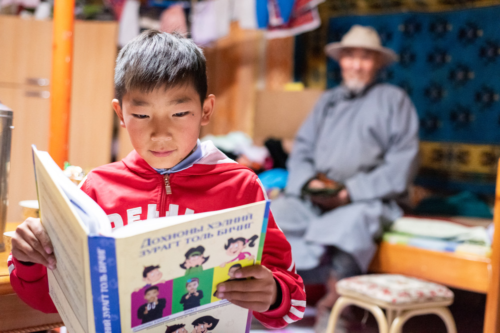 UNICEF ได้พัฒนาหนังสือสำหรับเด็กที่มีบกพร่องด้านการสื่อสาร เขาเป็นนักเรียนที่โรงเรียน General Education School #3 ในเมืองอัลไต