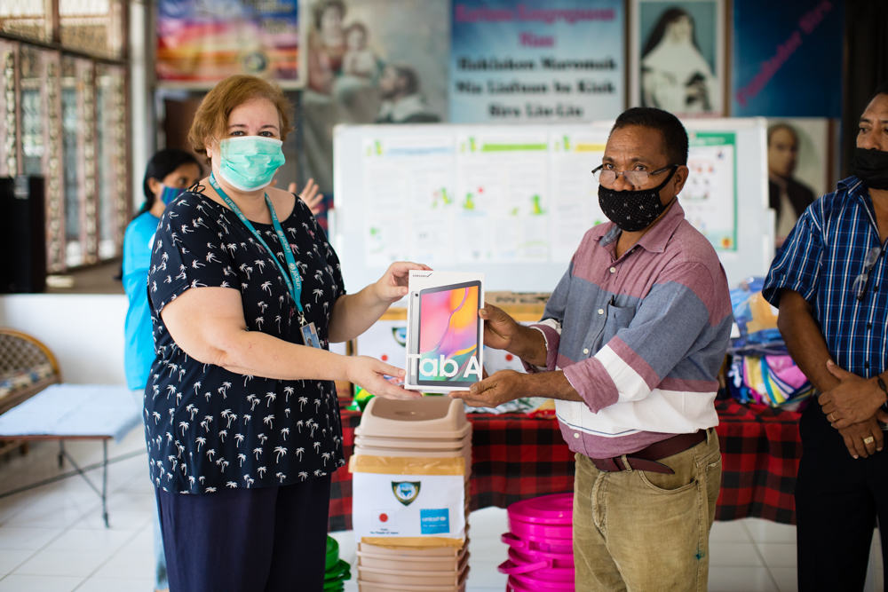 ผู้แทนองค์การ UNICEF ติมอร์-เลสเต วาเลรี ทาตอน มอบแท็บเล็ตจำนวนหนึ่งให้กับกระทรวงความเป็นปึกแผ่นทางสังคมและการมีส่วนร่วมที่สถานดูแลเด็กในดิลี แท็บเล็ตจะใช้เพื่อติดตามการตอบสนองของ COVID-19 ที่ดำเนินการโดยกระทรวงความเป็นปึกแผ่นและการมีส่วนร่วมทางสังคม