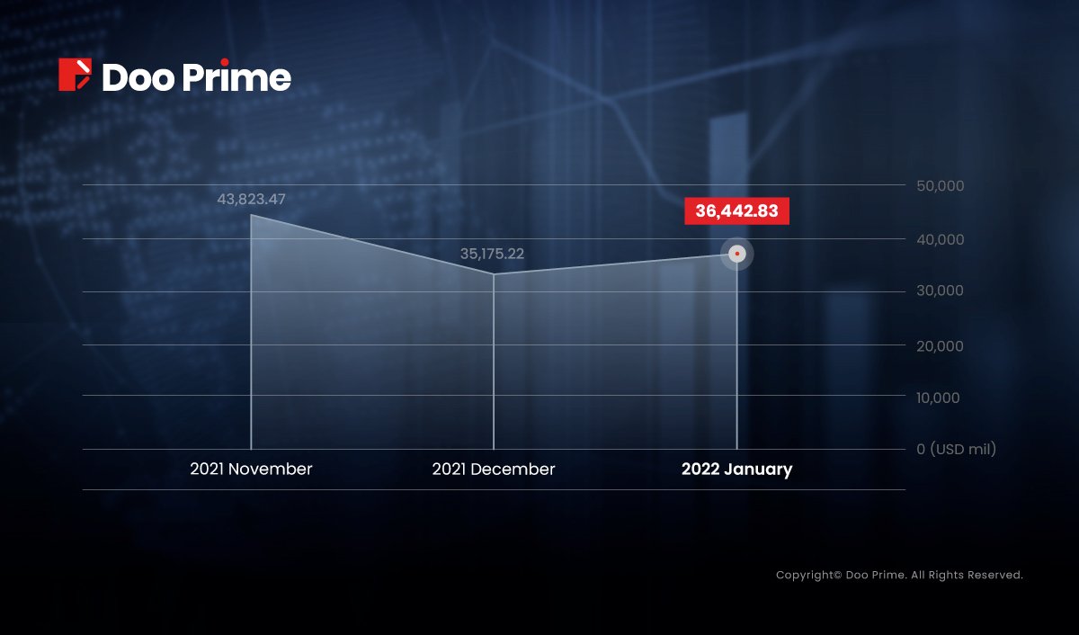 ปริมาณการซื้อขายทั้งหมดเพิ่มขึ้น 3.66% เมื่อเทียบกับเดือนก่อนหน้า หรือธันวาคม 2564 กล่าวได้ว่าในแต่ละปี Doo Prime จะมีปริมาณการซื้อขายเพิ่มขึ้นอย่างมีนัยสำคัญ 165.33% เมื่อเทียบกับ 1.37 หมื่นล้านดอลลาร์สหรัฐฯ ในเดือนธันวาคม 2563