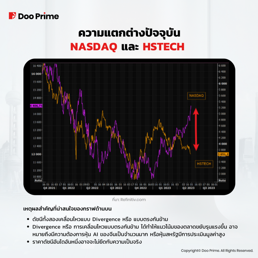 ตั้งแต่ต้นปี 2023 หุ้น AI ในสหรัฐฯ พุ่งขึ้นกว่า 30% ผลักดันดัชนี NASDAQ สู่ระดับสูงสุดใหม่ประจำปีนี้ ปิดฉากตลาดขาลงในปี 2022 แต่เมื่อพิจารณาดัชนี HSTECH ซึ่งใช้ติดตามหุ้นเทคของจีน กลับกลายเป็นว่าหุ้นไปในทิศทางตรงข้ามกับสหรัฐฯ