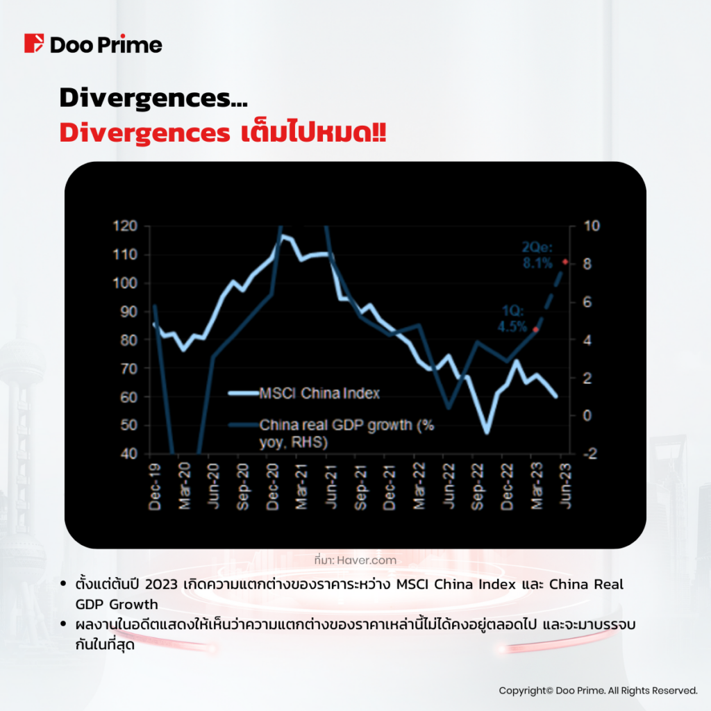 • ตั้งแต่ต้นปี 2023 เกิดความแตกต่างของราคาระหว่าง MSCI China Index และ China Real GDP Growth