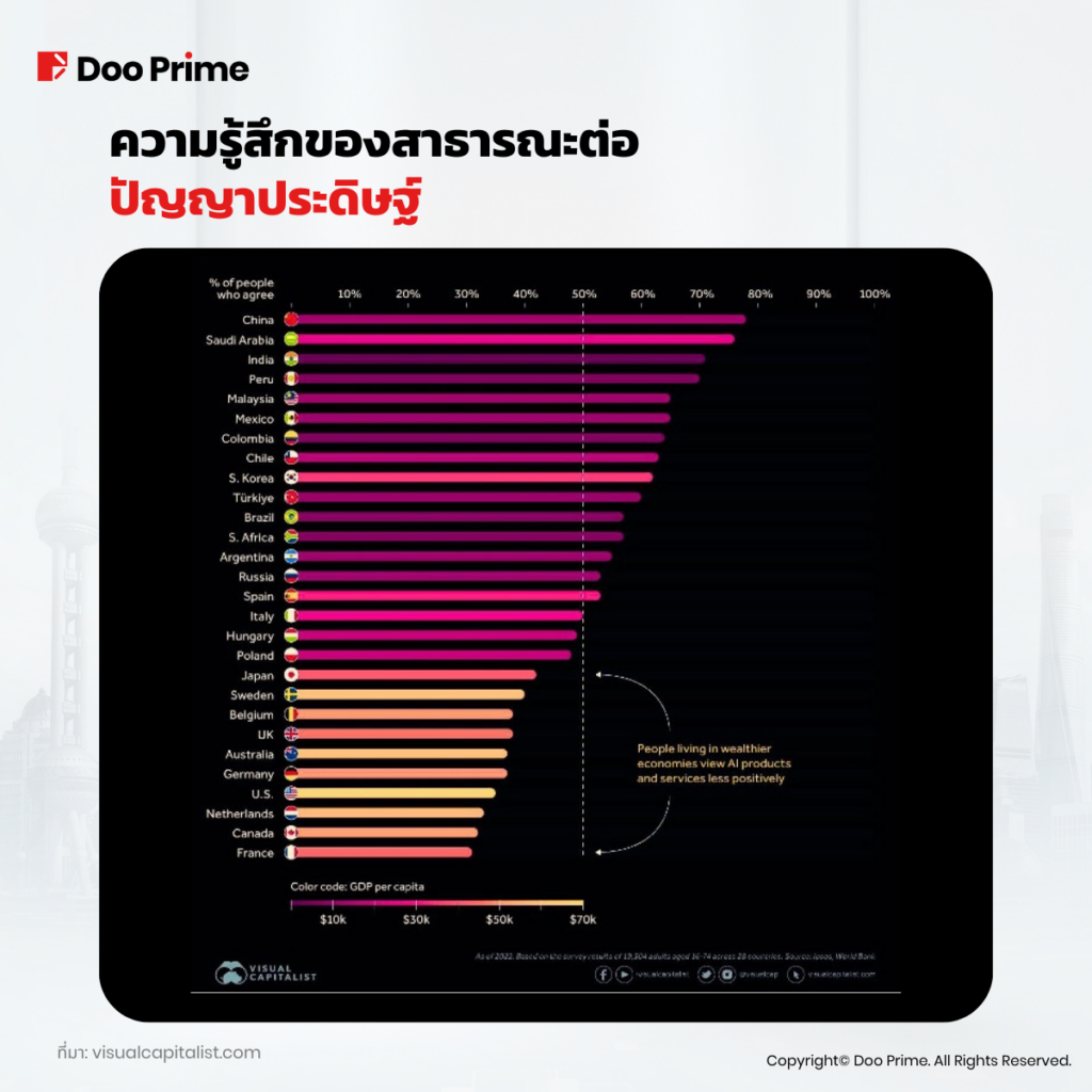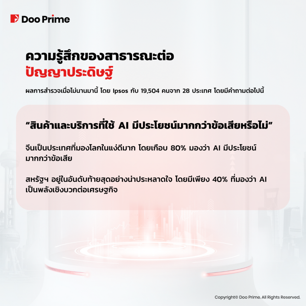 จีนเป็นประเทศที่มองโลกในแง่ดีมาก โดยเกือบ 80% ของผู้คนมองว่า AI มีประโยชน์มากกว่าข้อเสีย