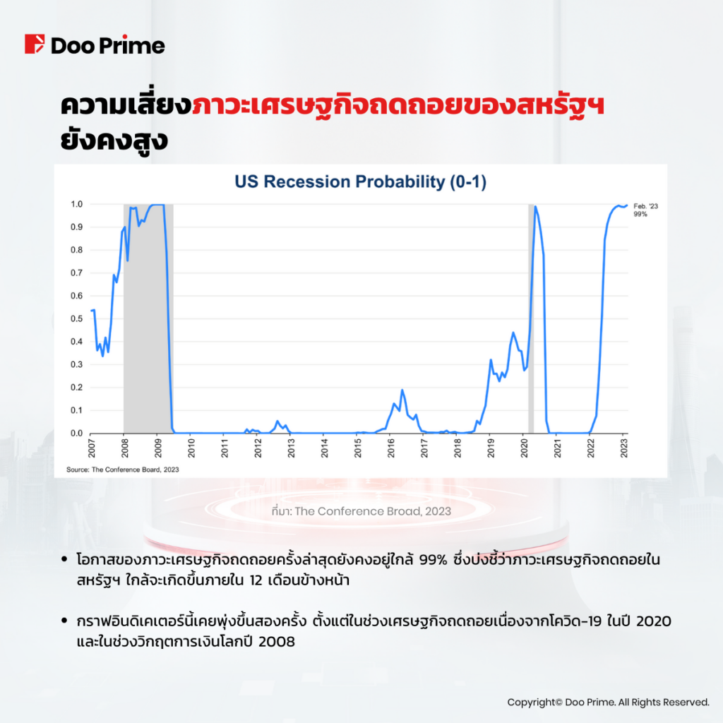 • โอกาสความน่าจะเป็นของภาวะเศรษฐกิจถดถอยครั้งล่าสุดยังคงอยู่ใกล้ 99% ซึ่งบ่งชี้ว่าภาวะเศรษฐกิจถดถอยในสหรัฐฯ ใกล้จะเกิดขึ้นภายใน 12 เดือนข้างหน้า