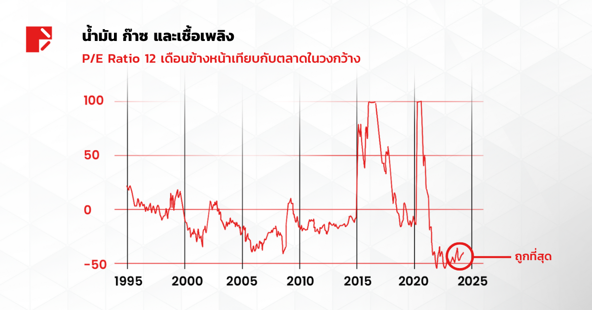 ตามกราฟด้านบน อัตราส่วน P/E (ราคาต่อรายได้) ที่ต่ำสำหรับน้ำมัน ก๊าซ และเชื้อเพลิงของสหรัฐอเมริกานั้นทำให้ราคาถูกเมื่อเทียบกับตลาด นี่อาจเป็นปัจจัยที่ต้องพิจารณาเมื่อประเมินความเสี่ยงของราคาน้ำมันที่สูงขึ้น อย่างไรก็ตาม สิ่งสำคัญคือต้องจำไว้ว่าการประเมินมูลค่าที่ต่ำไม่ได้รับประกันถึงราคาที่เพิ่มขึ้น แต่เป็นการตัดความเชื่อมโยงระหว่างราคาน้ำมันในปัจจุบันกับความคาดหวังของนักลงทุนต่อความสามารถในการทำกำไรในอนาคตสำหรับบริษัทน้ำมัน