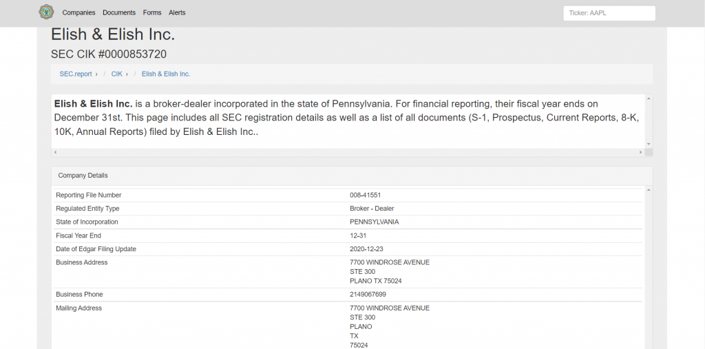 บริษัทการเงินที่ได้รับรองอย่างถูกต้อง จะมีข้อมูลทางกฎหมายและรายละเอียดใน US SEC Register นอกเหนือจาก US SEC แล้ว Elish & Elish Inc. ยังอยู่ภายใต้การควบคุมโดยหน่วยงาน US FINRA ด้วย