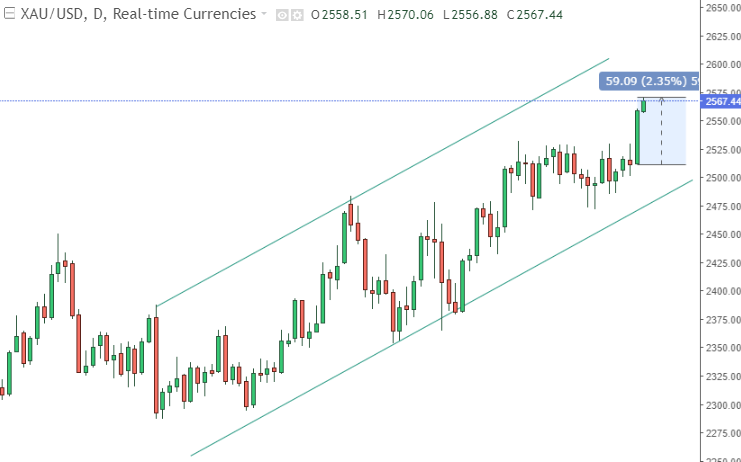 Hiện tại, giá vàng tiếp tục tăng vào lúc 11:00 Việt Nam. XAUUSD giao dịch ở mức 2,567.81, tức tăng hơn 0,3% so với đỉnh được thiết lập ngày hôm qua. Đà tăng là khó rõ ràng, được tích lũy từ đầu năm nay nên vẫn có dư địa tăng tiếp.