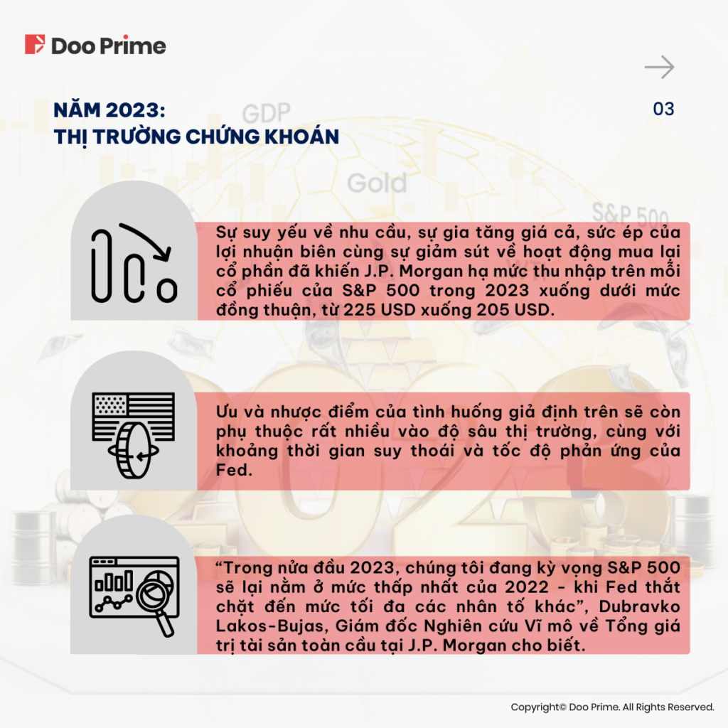 Trên cơ sở này, nghiên cứu của J.P. Morgan đã hạ mức thu nhập trên mỗi cổ phiếu (EPS) của chỉ số S&P 500 trong năm 2023 xuống dưới mức đồng thuận, cụ thể là từ 225 USD xuống 205 USD. Nguyên nhân là bởi nhu cầu và sức mạnh định giá đang dần suy yếu. Bên cạnh đó, lợi nhuận biên đang chịu nhiều sức ép và hoạt động mua lại cổ phần đang suy giảm.