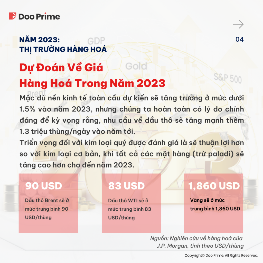Theo như bài nghiên cứu về hàng hóa của J.P. Morgan, dự báo về giá hàng hóa trong năm 2023 cho thấy giá dầu thô Brent đang ở ngưỡng trung bình là 90 USD/thùng, dầu thô ngọt nhẹ Texas (WTI) ở mức 83 USD và vàng ở mức 1,860 USD tính riêng trong quý IVcủa năm 2023.